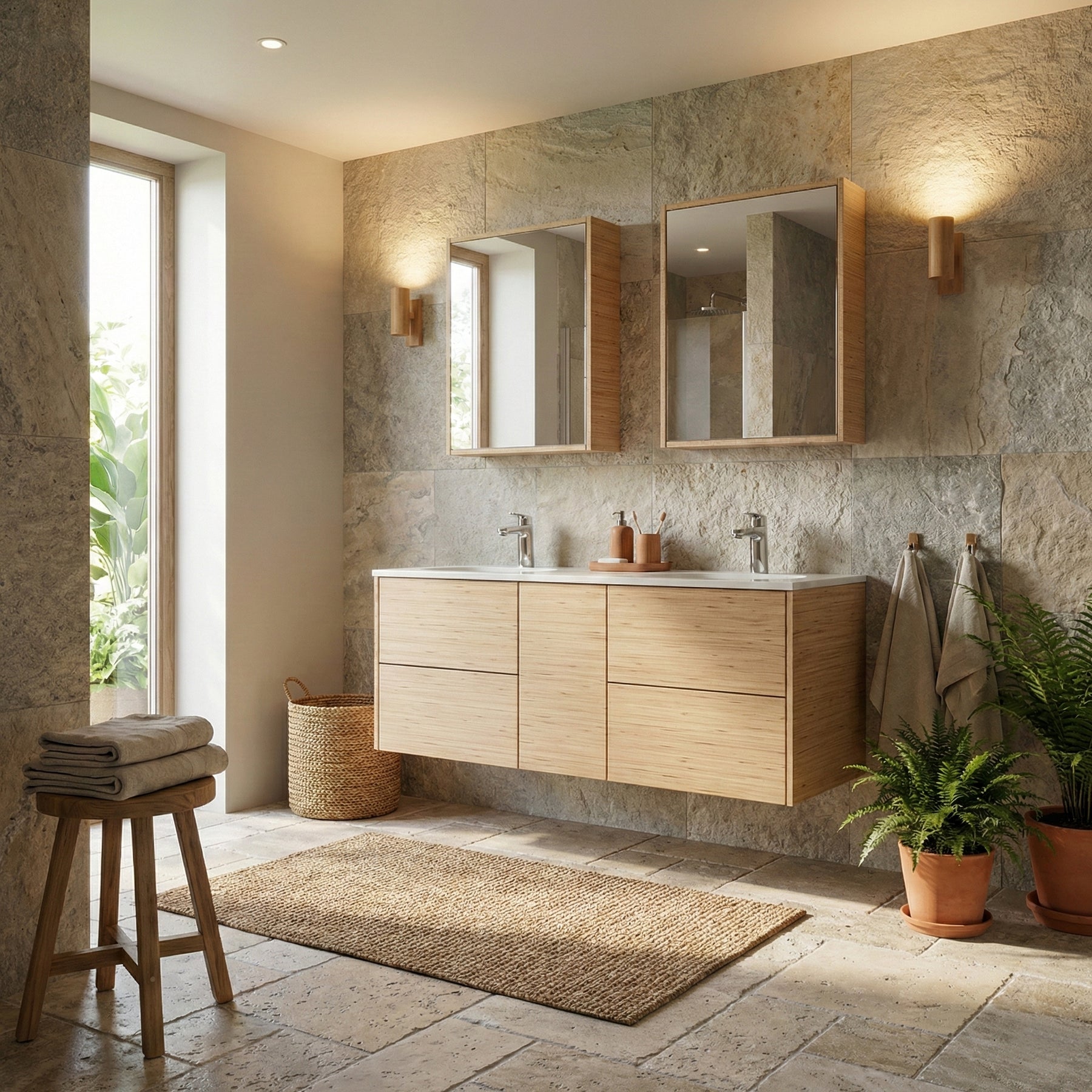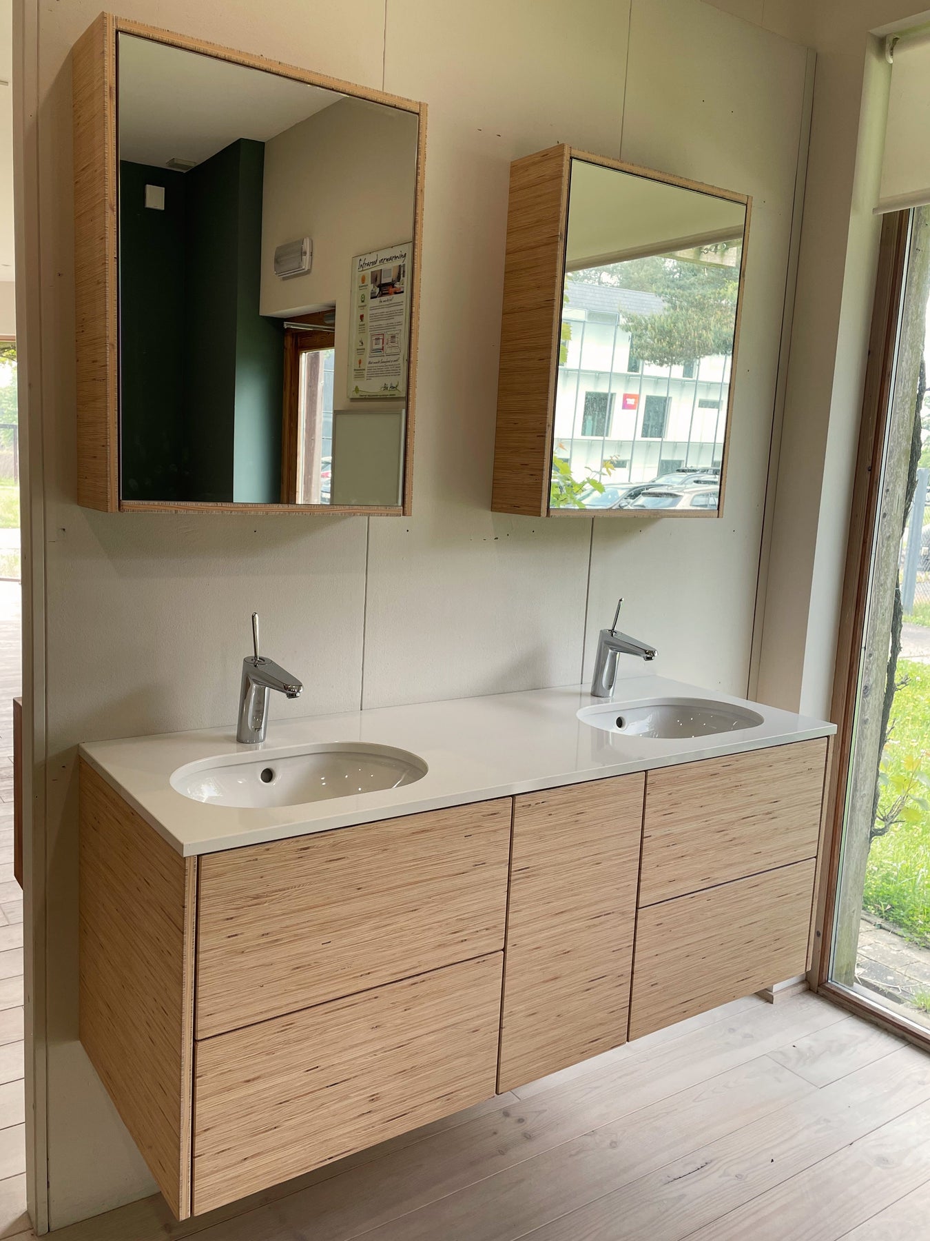 Spiegelkastjes voor de badkamer, in Tilly vuren Fineline: smalle strookjes vurenhout, verlijmd met zwarte gepigmenteerde lijm creëren een interessant lijnenspel. Behandeld met witte olie.