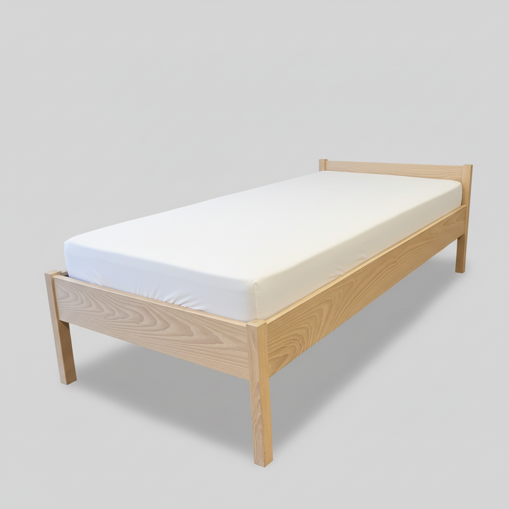 Eenpersoons bed in massieve, Europese es met FSC label, zonder formaldehyde. Wit geölied. De bijpassende nachtkast is apart verkrijgbaar.